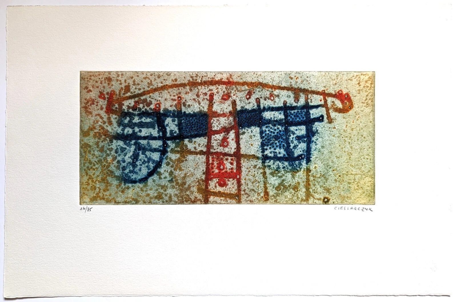 Musique pour Martouchka. Gravure à l'eau-forte et fleur de souffre. plaque : 33 x 15 cm. Feuille : 49,5 x 32,5 cm. Tirage sur papier Johannot, numéroté "14/75", signé. Cachet à froit "JGC" (Jeune gravure contemporaine).