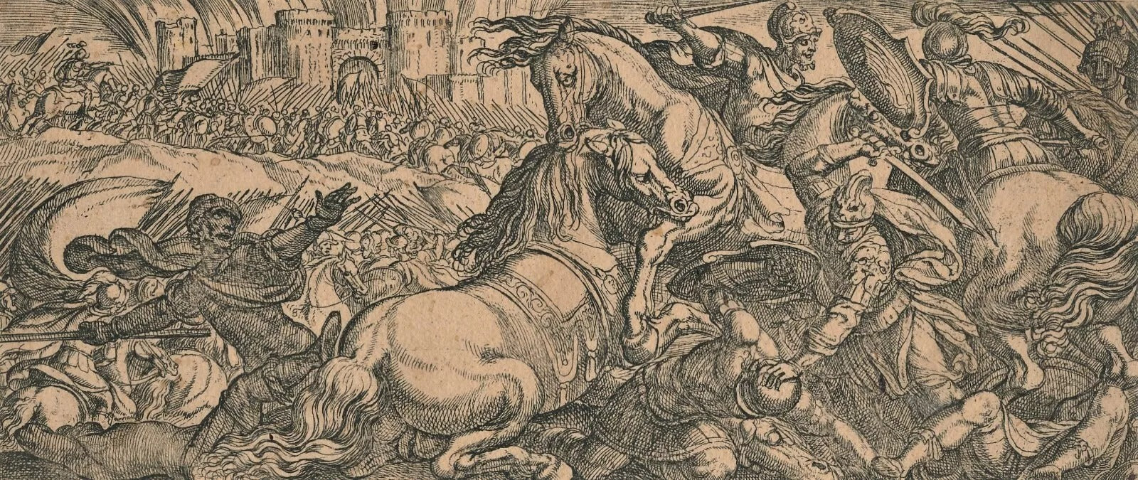 Scène de bataille avec deux chevaux s’attaquant. La suite originale compte 10 scènes de bataille.