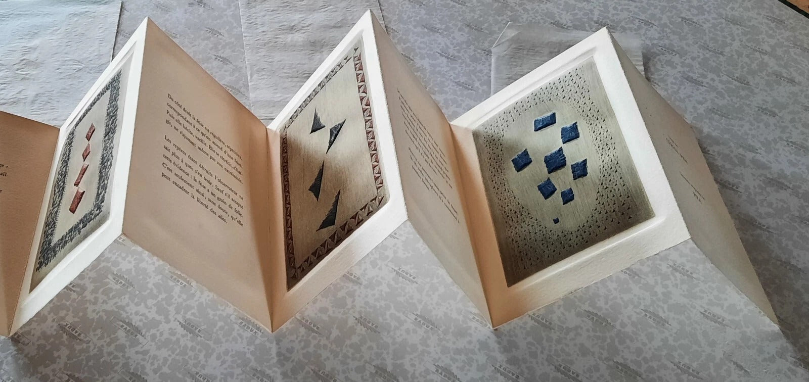 Approches. [Paris], 1979, 11,5 x 15,5 cm. Loporello avec trois gravures de Piza et trois textes de Clélia Piza, son épouse. Sous chemise à trois volets à rabats. Édition originale, un des 55 exemplaires numérotés sur vélin d'Arches, n° 23, signé par les deux auteurs.