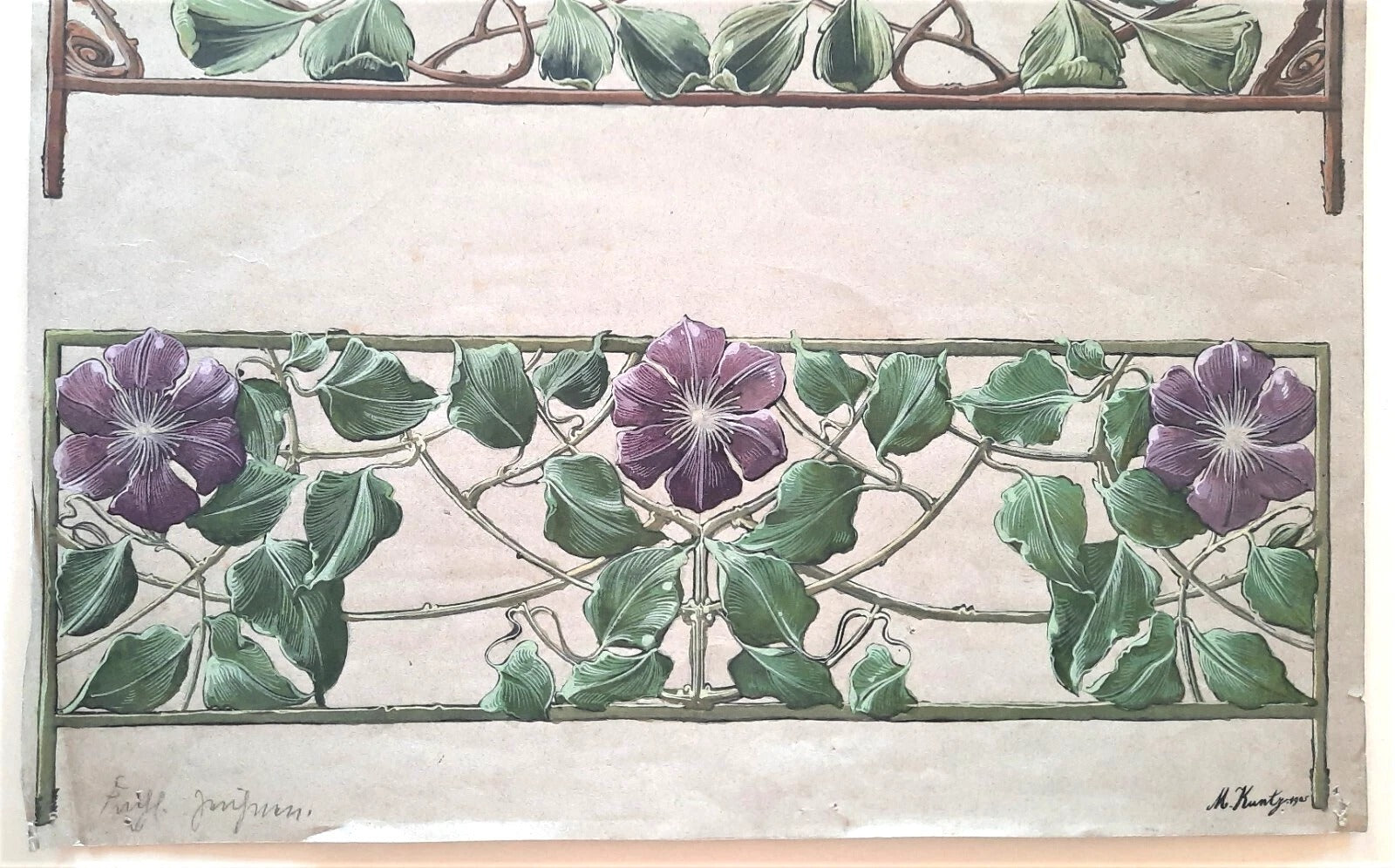 Aquarelle et gouache sur papier. Feuille signée (M. Kuntz) en bas à droite et datée "1905". 58 x 41,2 cm. Trous d’épingle, traces de manipulation, froissement des bordures.