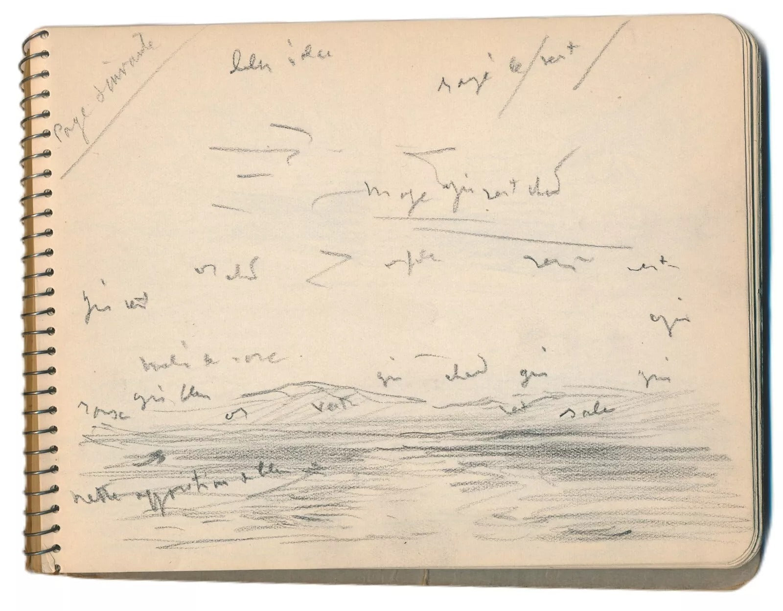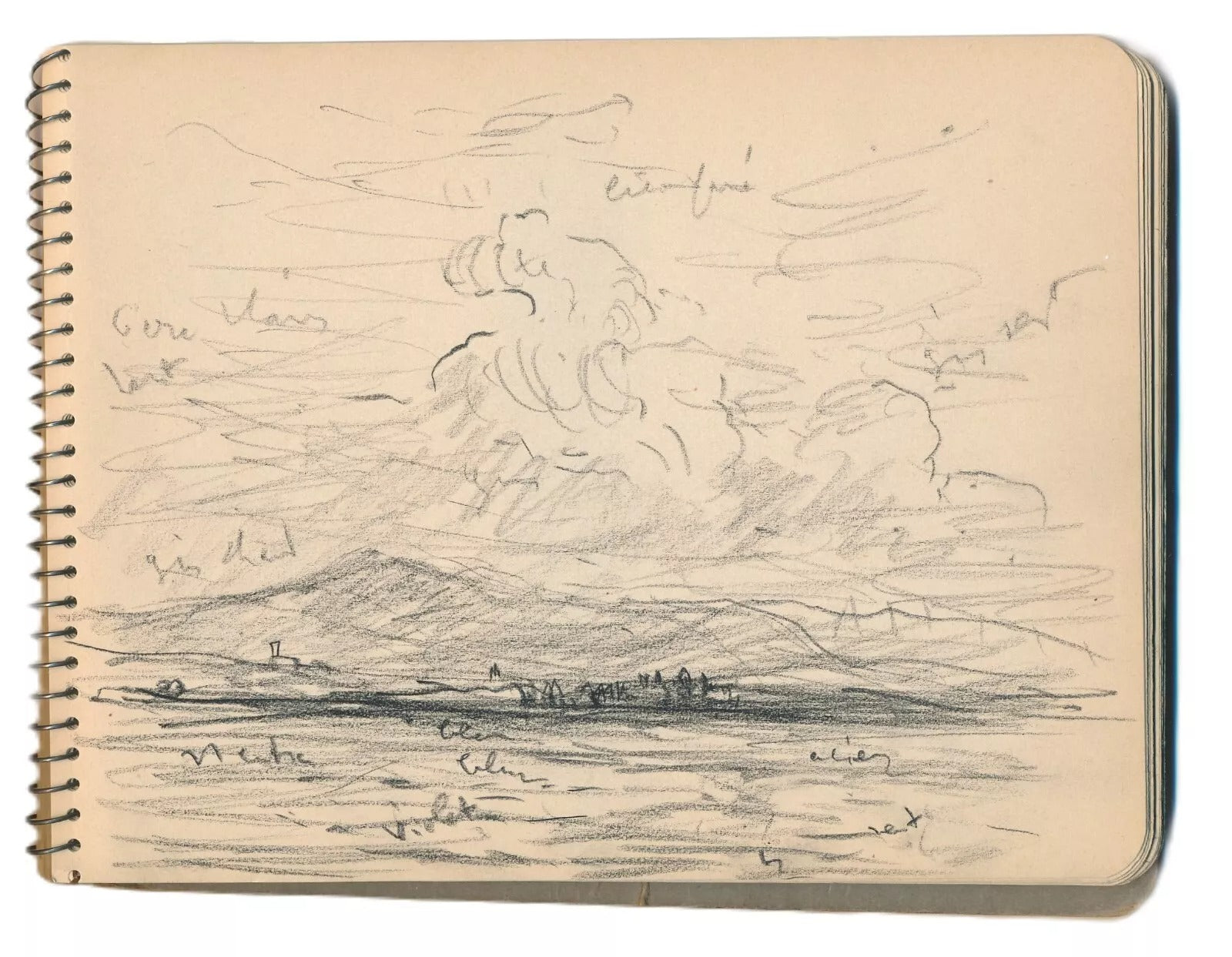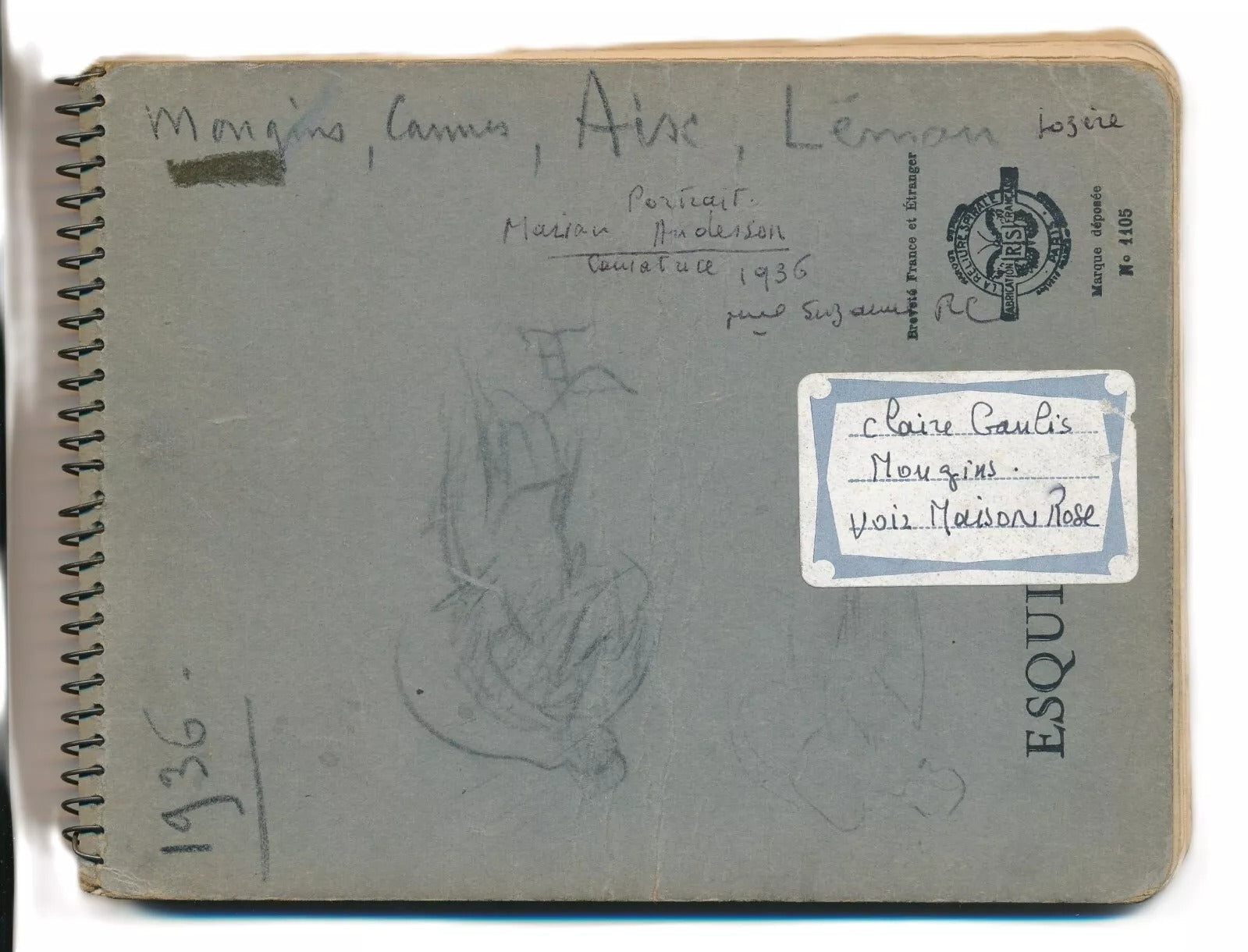 Carnet à spirales de dessins, études et croquis au crayon noir intitulé « Mougins, Cannes, Aix, Leman, Lozère (…) 1936 », une étiquette collée sur la couverture du cahier porte la mention « Claire Gaulis Mougins voir Maison rose ». 14 x 18 cm. 65 p.