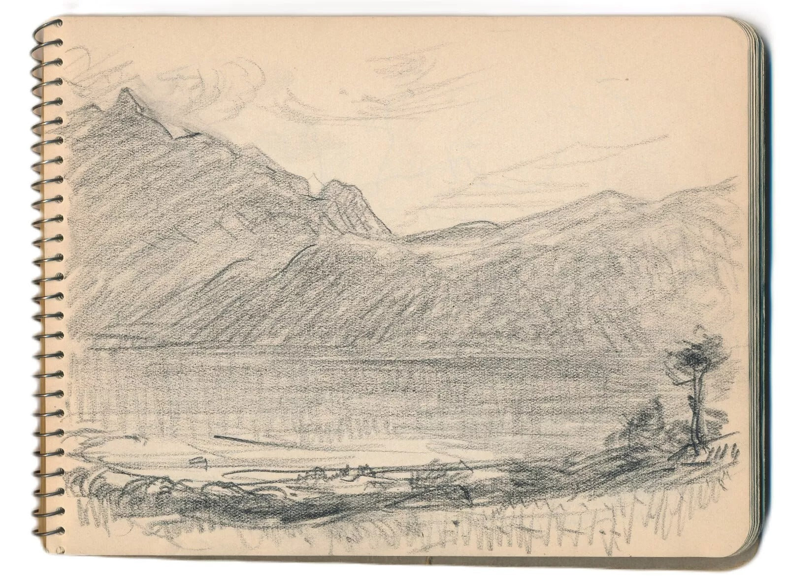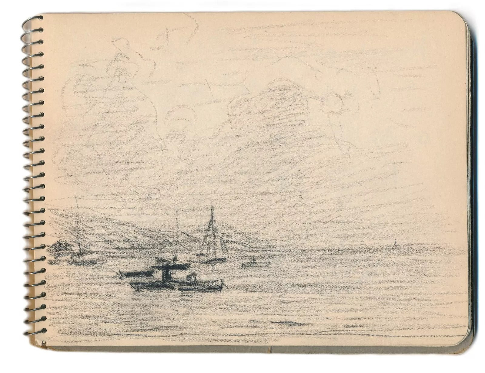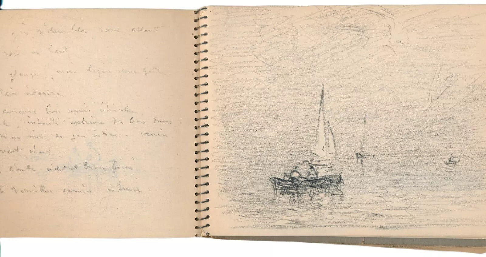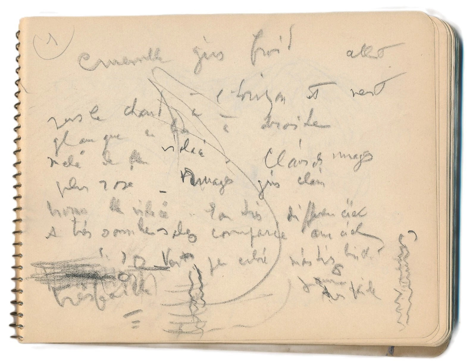 Carnet à spirales de dessins, études et croquis au crayon noir intitulé « Mougins, Cannes, Aix, Leman, Lozère (…) 1936 », une étiquette collée sur la couverture du cahier porte la mention « Claire Gaulis Mougins voir Maison rose ». 14 x 18 cm. 65 p.