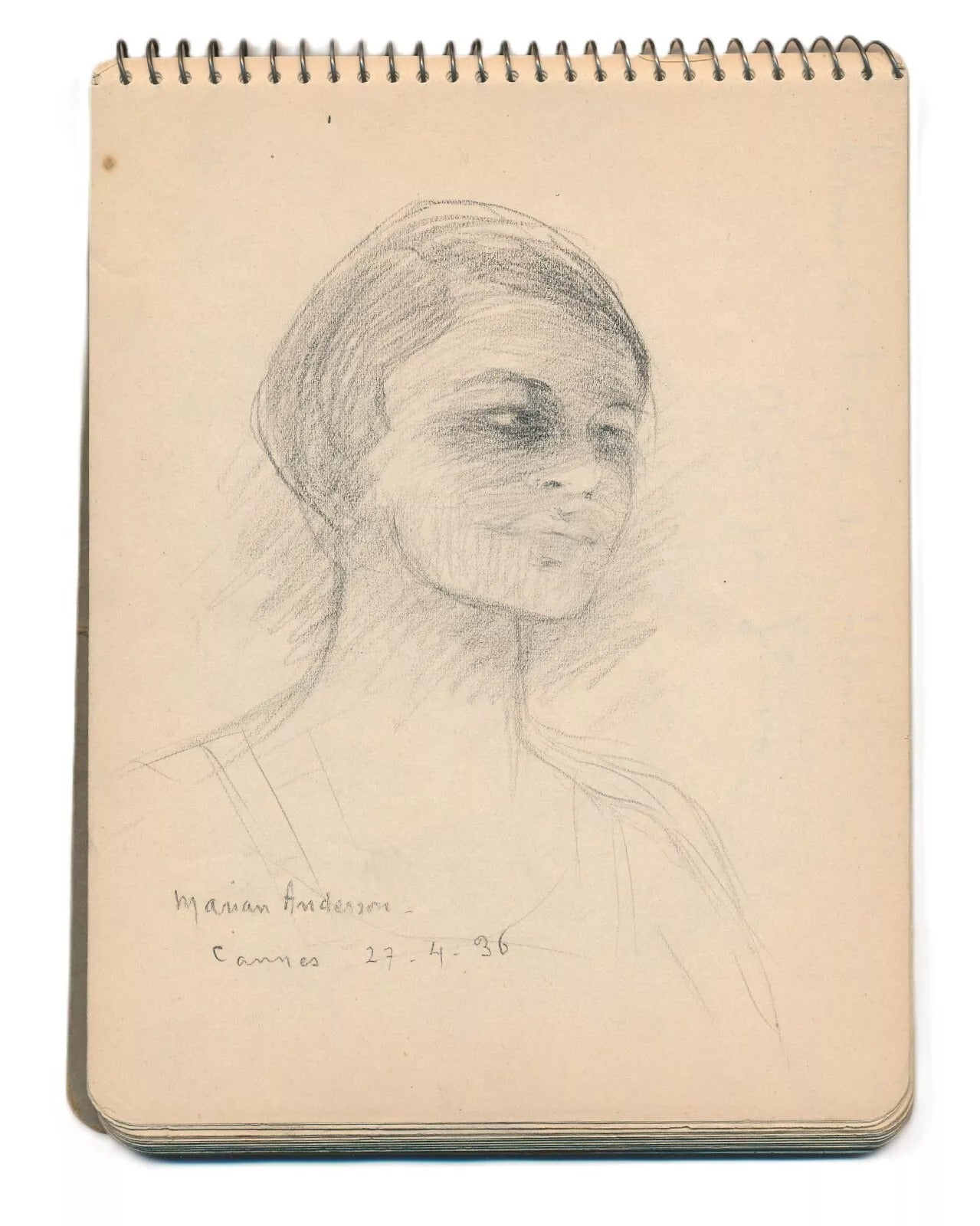 Parmi les vues de paysages et scènes animées : un portrait de la contralto afro-américaine Marian ANDERSON (18971993) légendé, situé et daté « Cannes, 27 .4. 36 ».