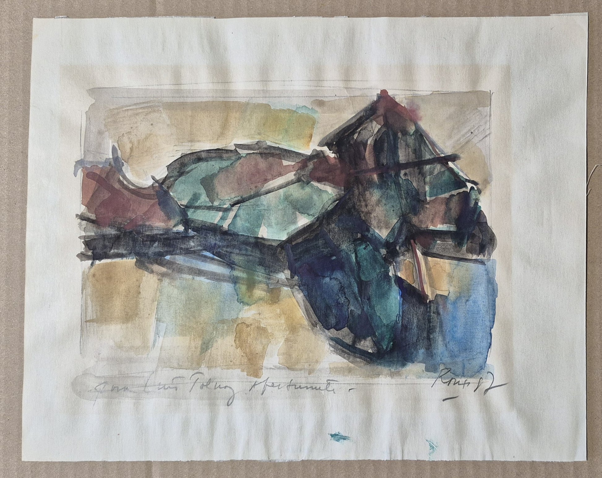 Aquarelle signée, datée de 1987, et dédicacée. 29,5 x 20,5 cm. Sur papier avec traces d’oxydation dû à l’encadrement. Les bords du papier ondulent.
